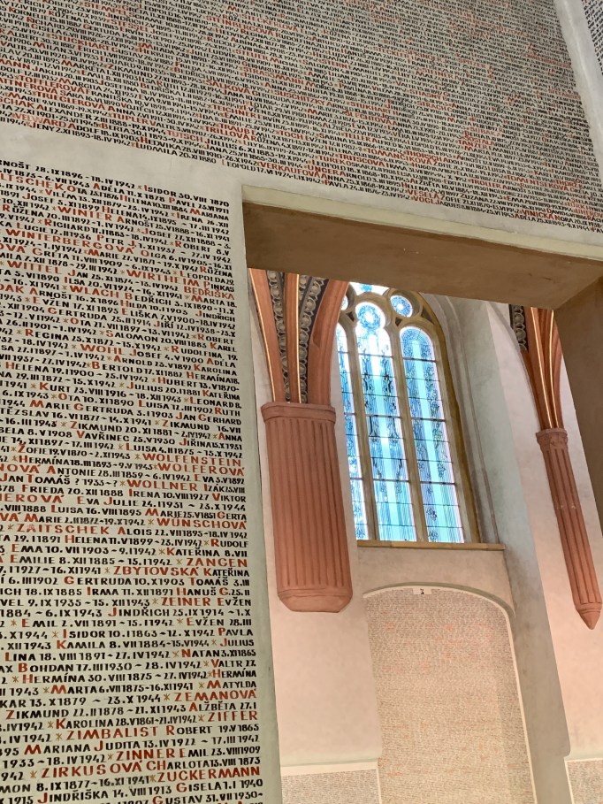 Next is the Pinkas Synagogue which was built in 1535 and now serves as a memorial to the Jews of Bohemia and Moravia who were murdered by the Nazis in WWII. 77,297 names cover the walls in this sobering exhibit. A cantor can be heard chanting out their names. This is a very emotional exhibit, especially when you go upstairs to see the Children’s Art Exhibit, art created by kids in the Terezin Labor Camp from 1942-44 under the direction of Mrs. Friedl Dicker who hid the works before being sent to her death at Auschwitz.