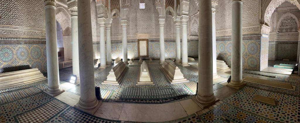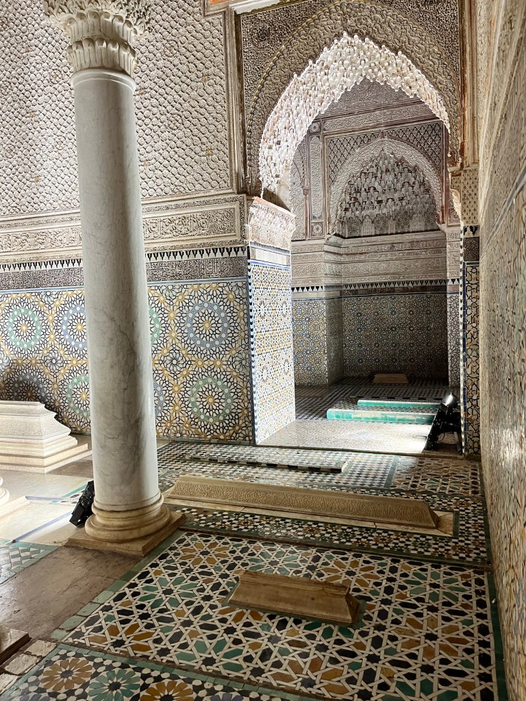 In the Kasbah we visited the Sa’didi Tombs where the most prominent of the rulers, their families, and some servants were buried. Note that in Moroccan culture, you typically do not find head stones with names. The only identification is based in your status and sex and is reflected in the size and shape of the graves.